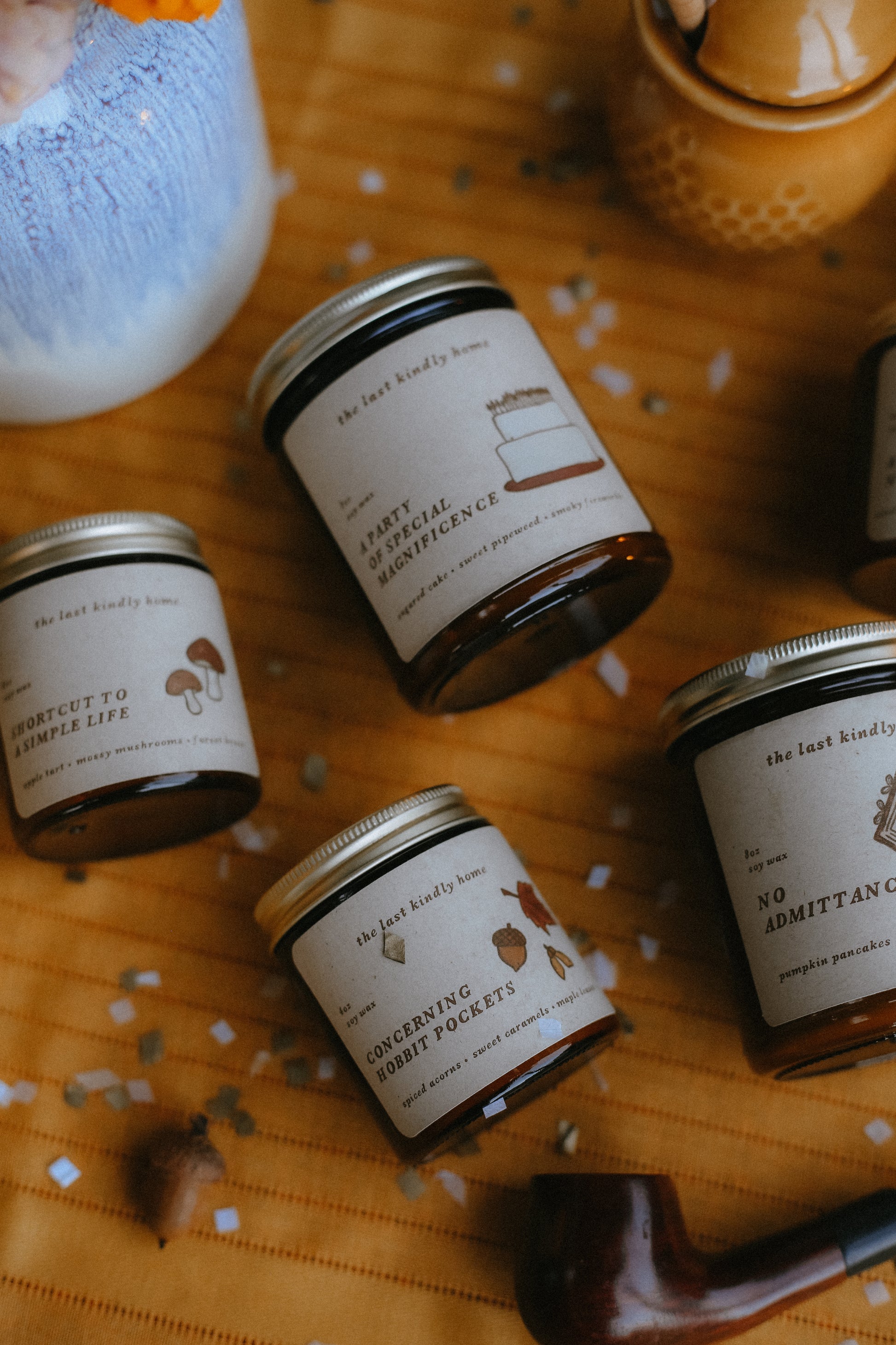 this candle comes in a beautiful amber jar with a gold lid and is available in a 4 oz or 8 oz size. the label is printed on kraft paper for a vintage vibe. the scent profile of this candle features notes of tobacco, wild sumac, campfire, sugar, and vanilla cake.