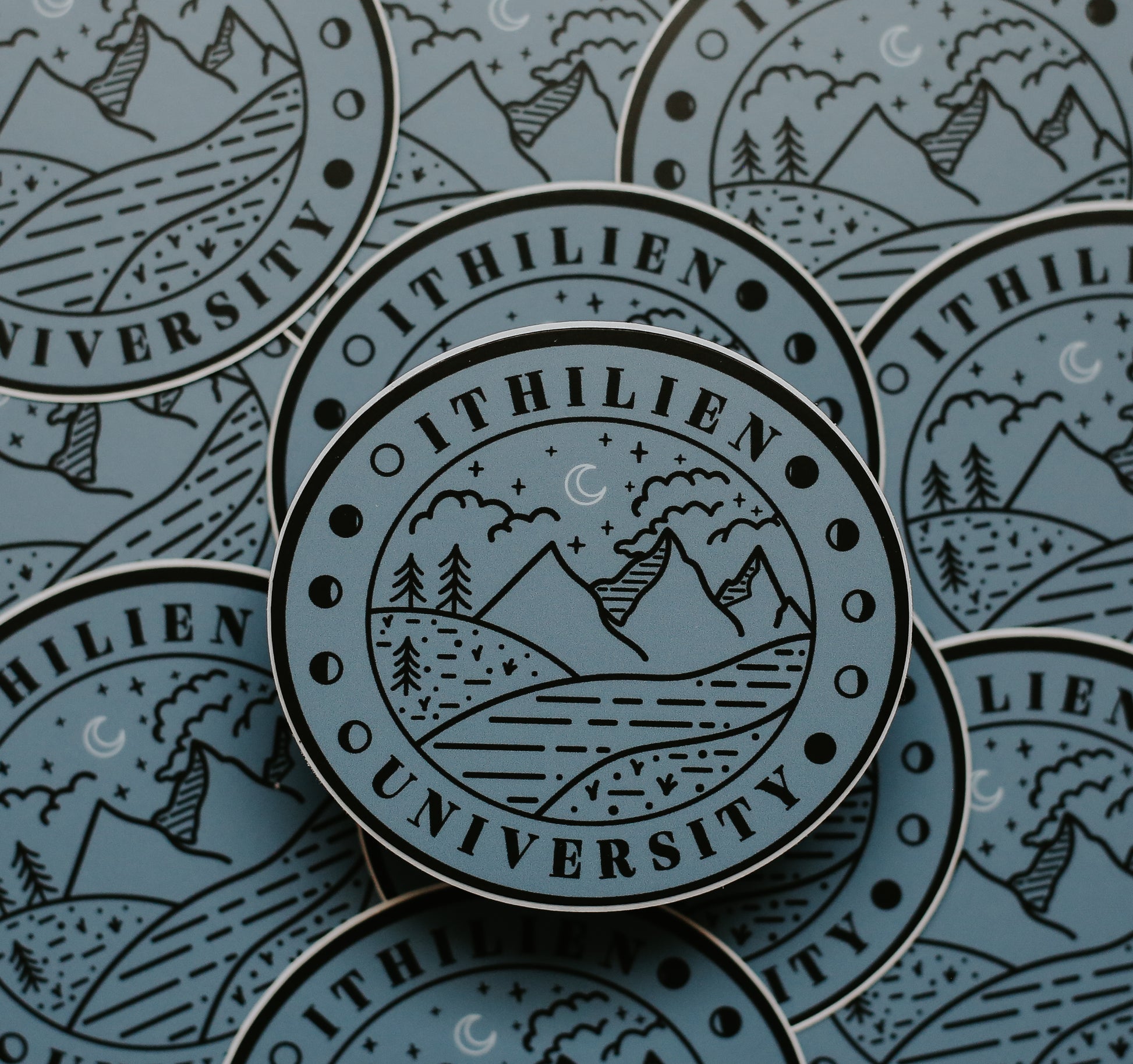 deck out your laptop, water bottle, or whatever you wish and show your school pride with this sticker of ithilien university's logo.