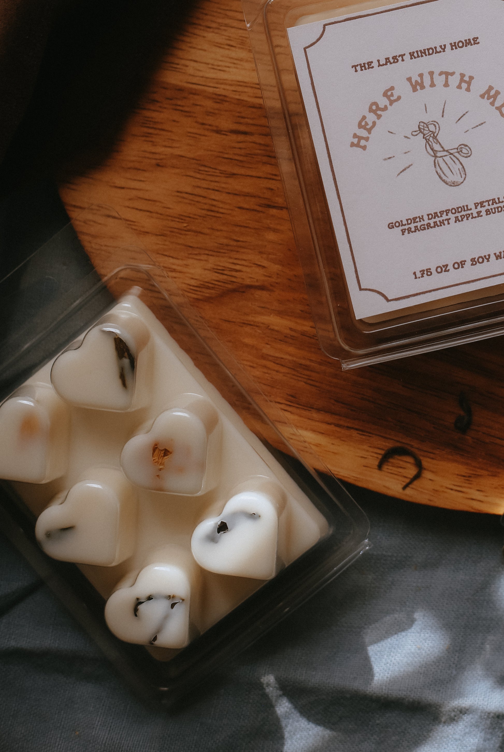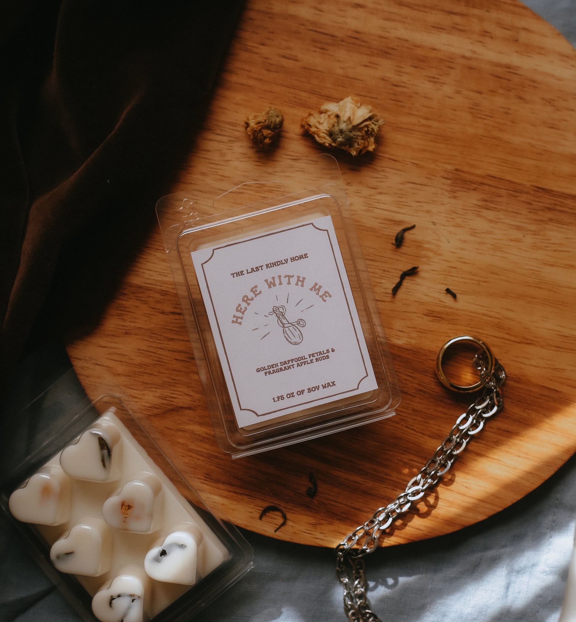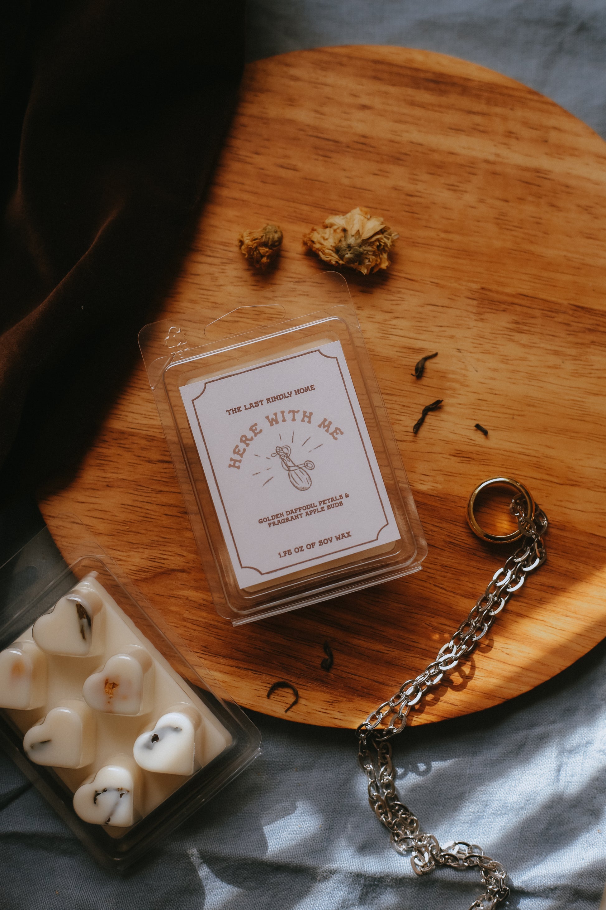 this wax melt comes in a recyclable clamshell featuring heart shaped sections. the wax melt is decorated with natural botanicals: jasmine tea bits for frodo and chrysanthemum buds for sam. the label is printed on hemp paper for more of a natural vibe. the artwork featured represents the sharing of burden between frodo and sam as they both carried and used the ring and phial of galadriel for a time. the scent profile of this wax melt features notes of daffodils, honeydew, white amber, apple leaf, apples, and oak wood. the wax melt comes with a mini playlist card of songs that represent the bond between sam and frodo.