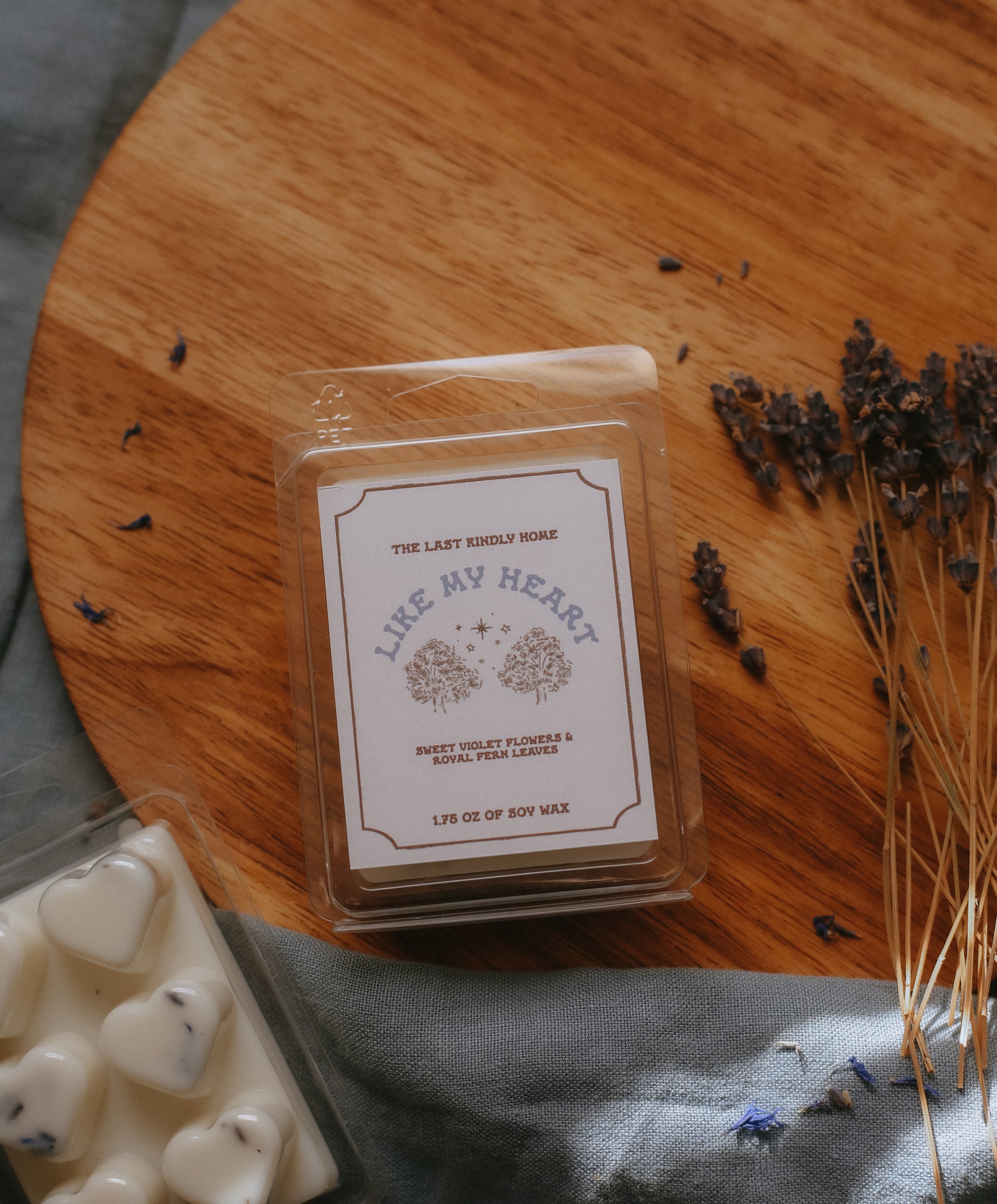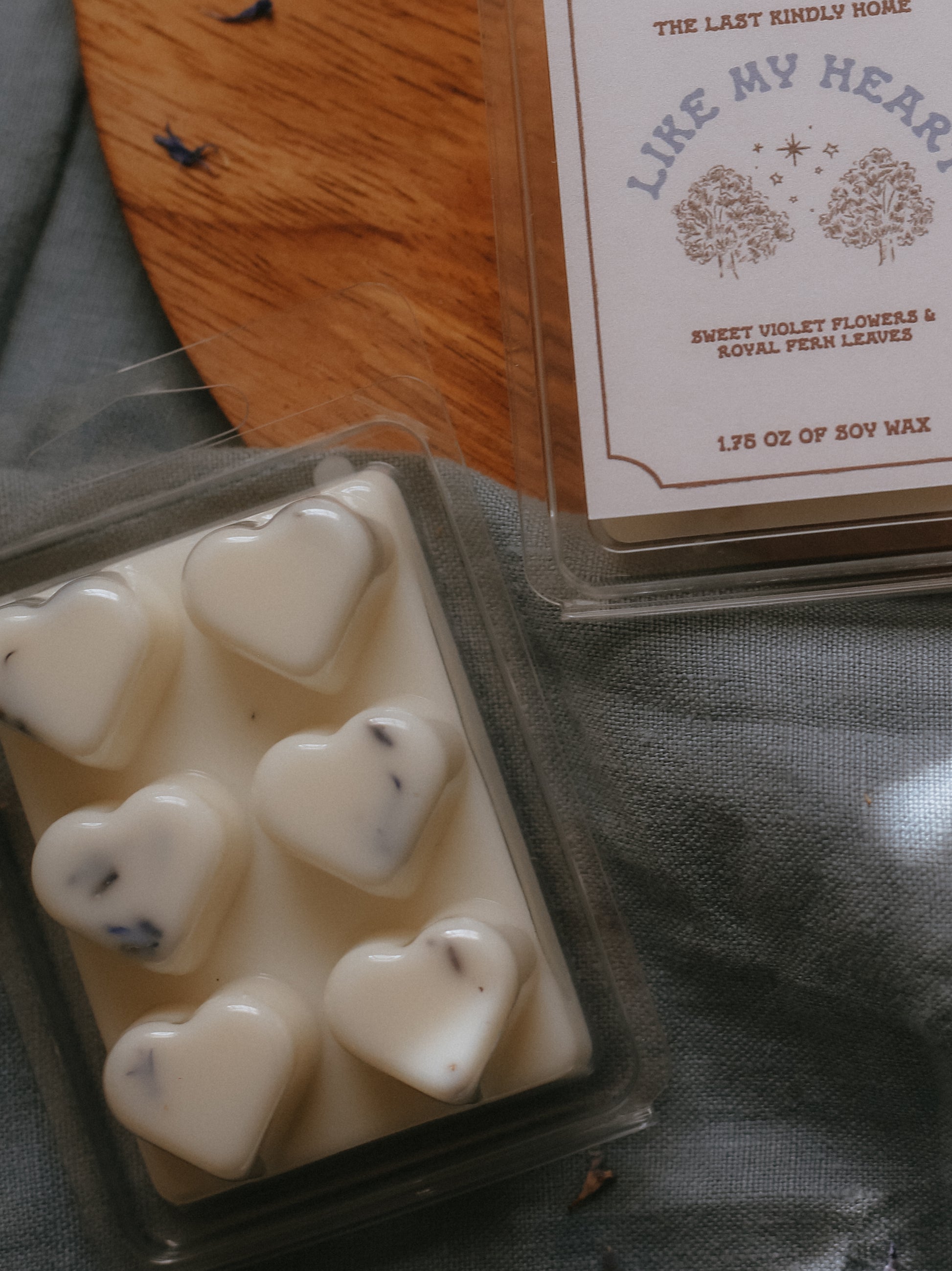 this wax melt comes in a recyclable clamshell featuring heart shaped sections. the wax melt is decorated with natural botanicals: cornflowers for aragorn and lavender buds for arwen. the label is printed on hemp paper for more of a natural vibe. the artwork featured represents both arwen and aragorn's connection to the stars and their first meeting at twilight, amongst the trees. the scent profile of this wax melt features notes of violets, rosewood, sandalwood, fern, jasmine, woods, and musk. the wax melt comes with a mini playlist card of songs that represent the devotion between arwen and aragorn.