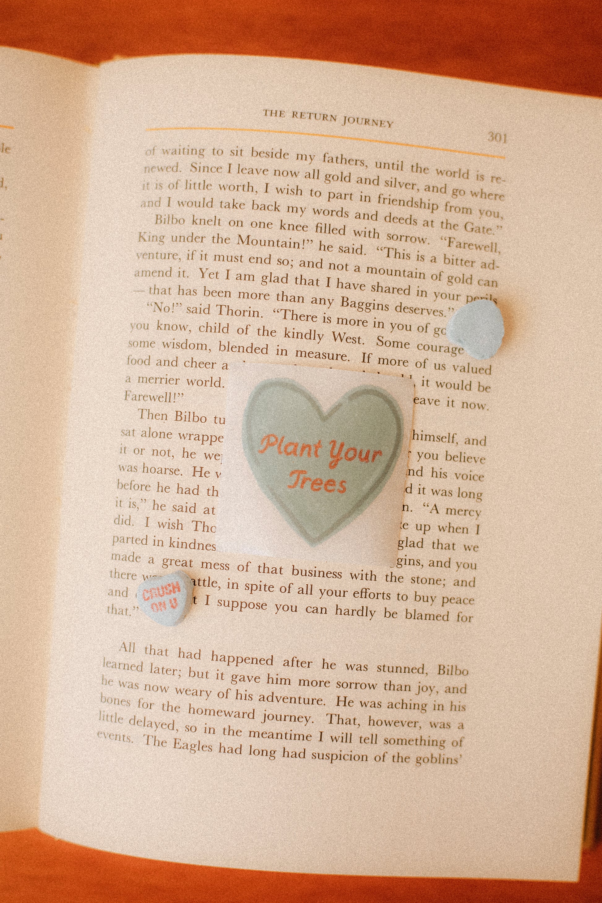 a little twist on the classic candy hearts design: but this time it's all about bilbo and thorin. represent your love for the duo with this clear, heart shaped sticker.