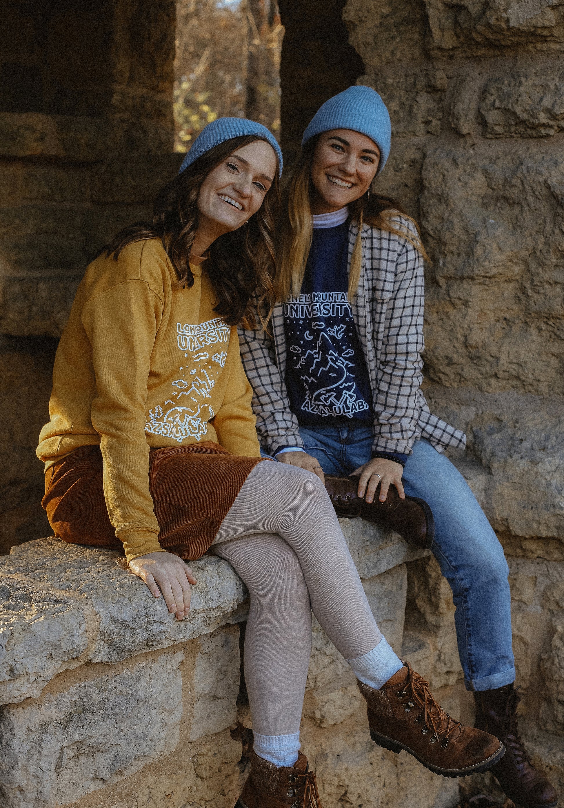 the gold sweatshirt is being modeled by Finley and the midnight blue sweatshirt is being modeled by Killian. Both are students at LMU.