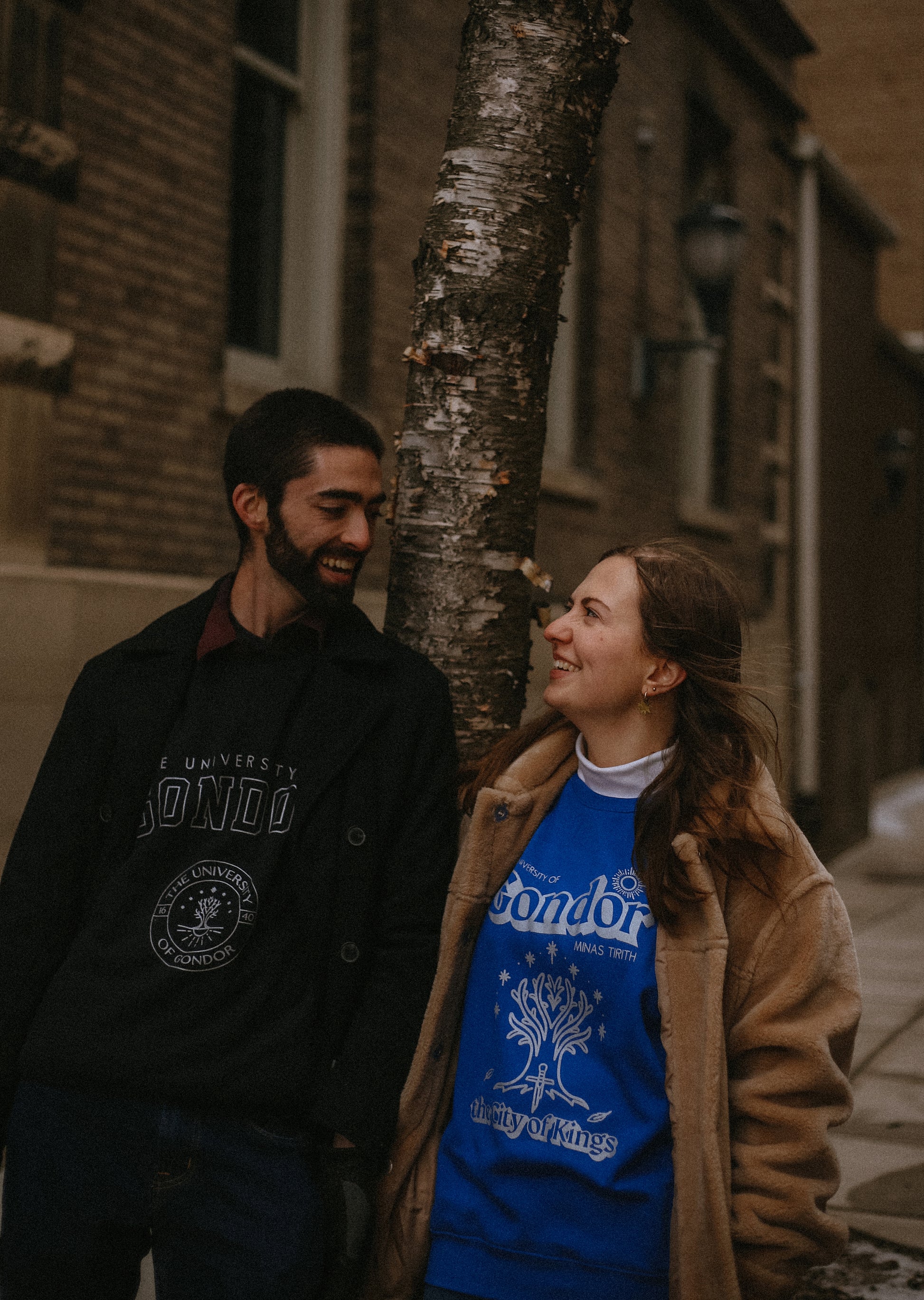 the sweatshirt is being modeled by argos thorn, social work major at the university of gondor.
