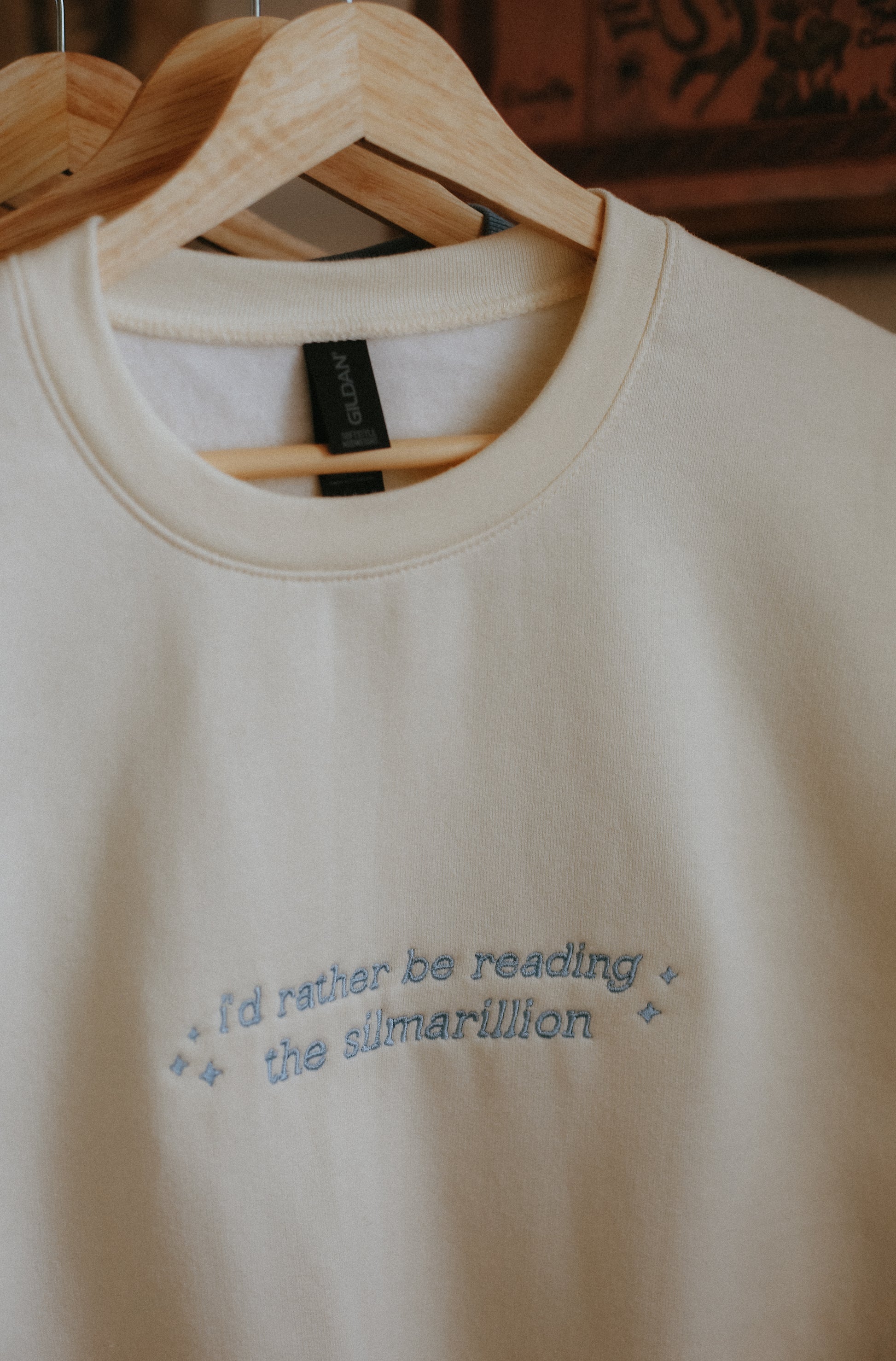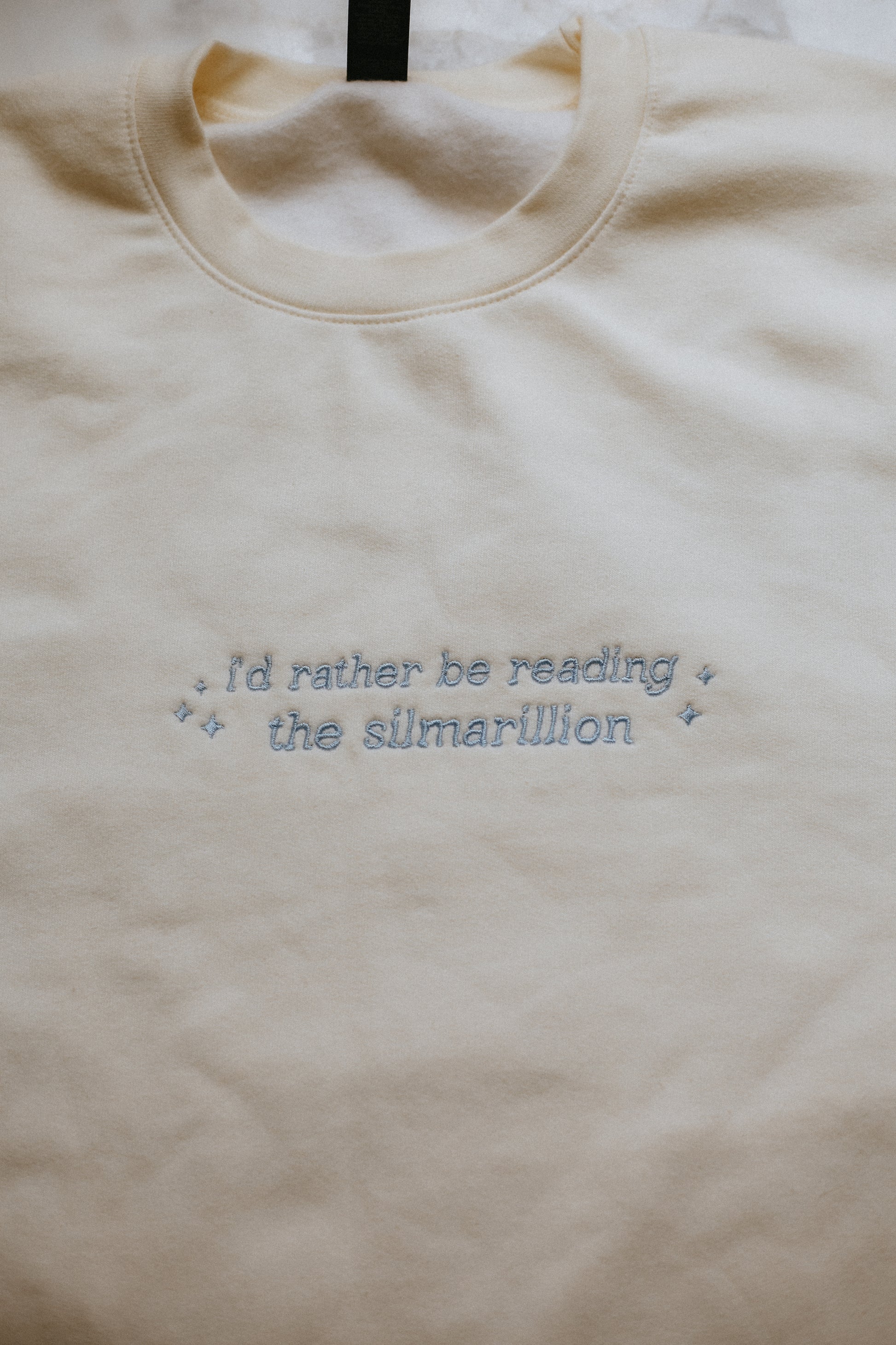 this sweatshirt features the phrase: "i'd rather be reading the silmarillion."