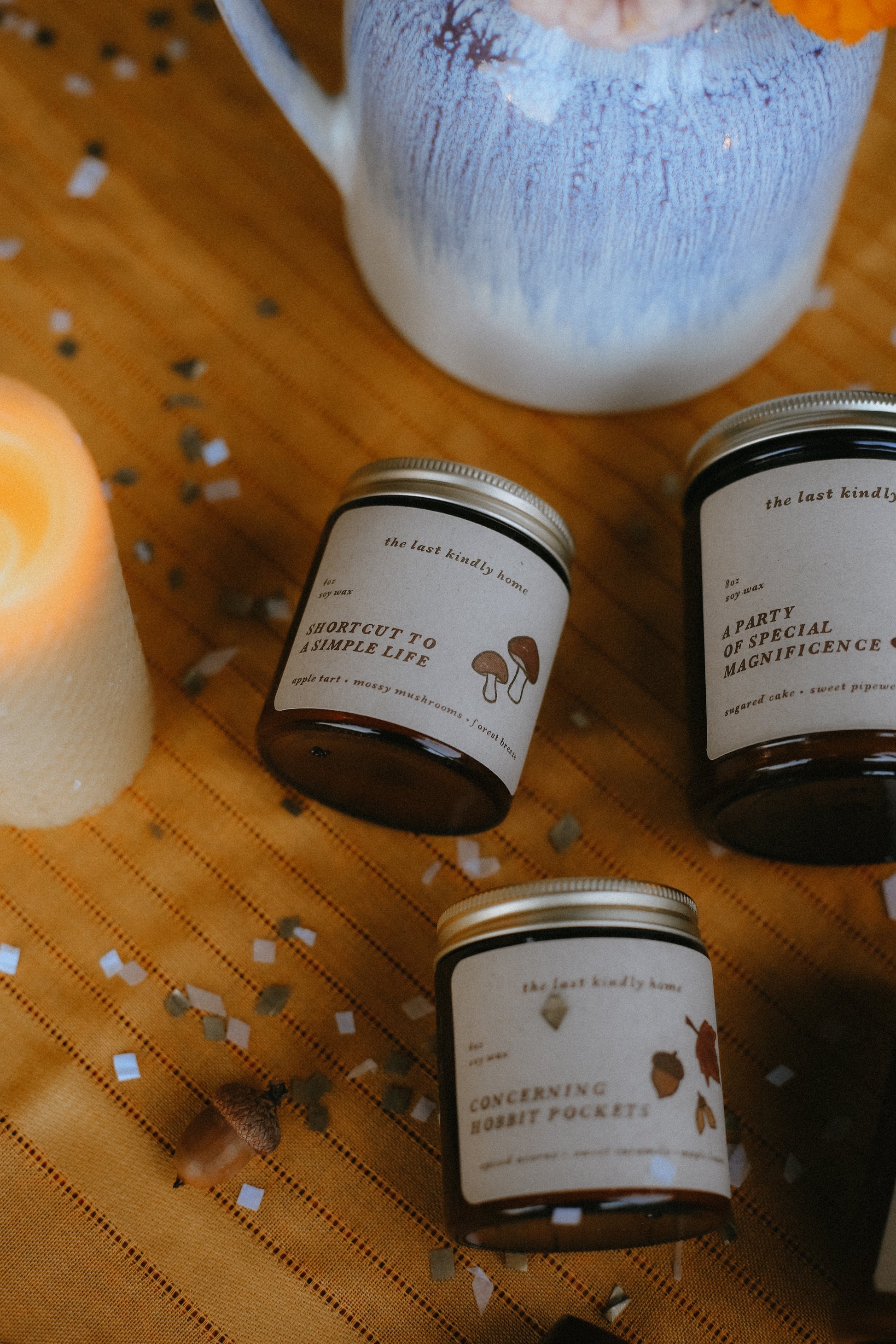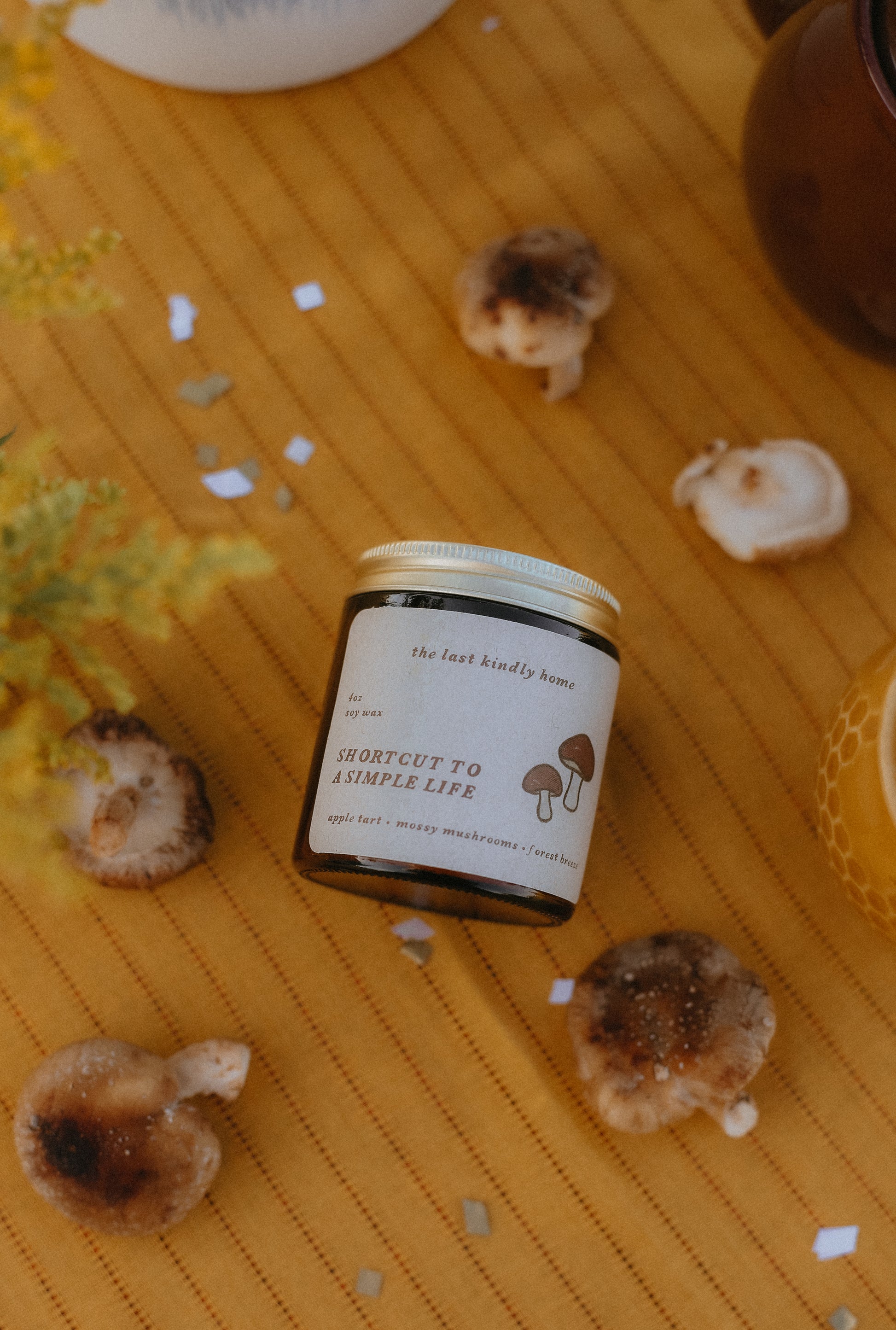 this candle comes in a beautiful amber jar with a gold lid and is available in a 4 oz or 8 oz size. the label is printed on kraft paper for a vintage vibe. the scent profile of this candle features notes of apple, vanilla, maple, moss, earth, mushroom, and autumn air.