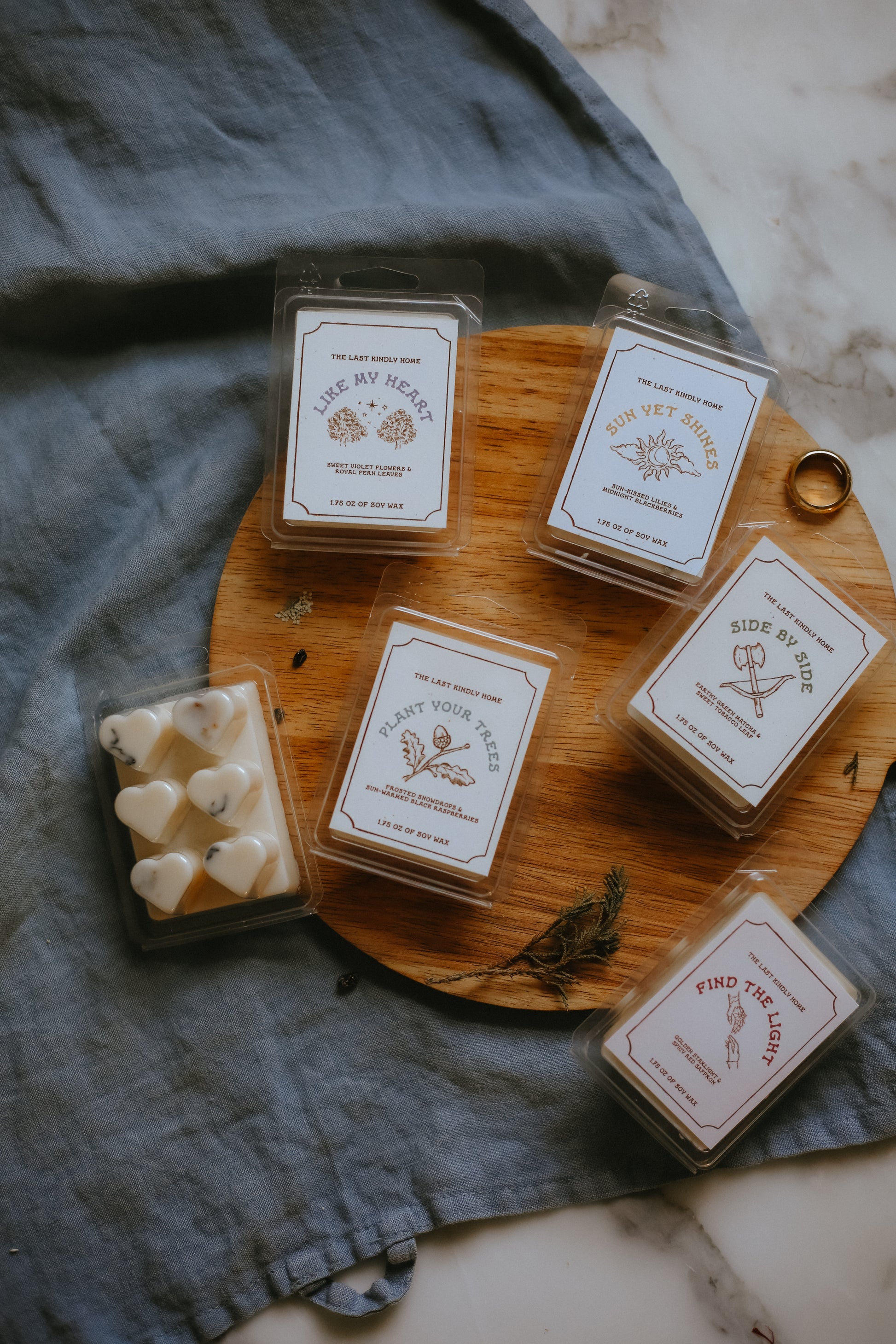 these wax melt come in recyclable clamshells featuring heart shaped sections. each the wax melt is decorated with natural botanicals or gems that represent the two halves of each pairing. the labels are printed on hemp paper for more of a natural vibe. each wax melt comes with a mini playlist card with songs that represent the pairing.