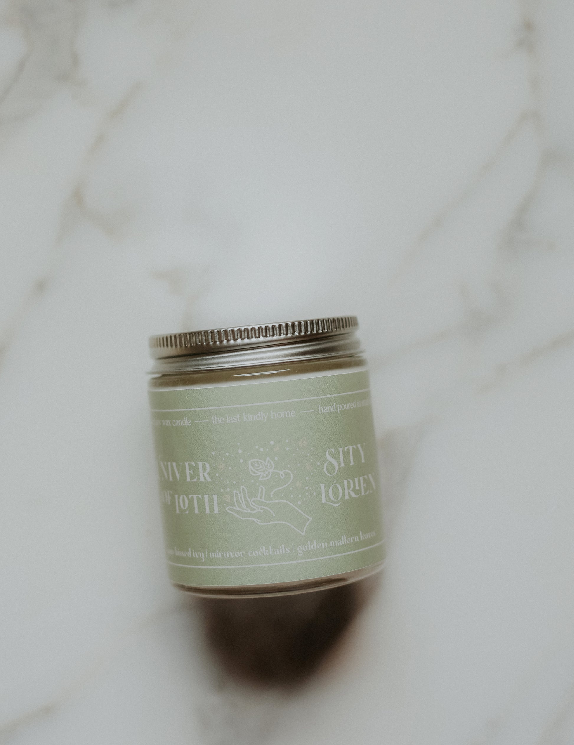 this candle has a bright and fresh scent that brings you right into the ethereal forest of lothlórien and makes you feel like you're watching fireflies dance around the golden wood while you sip on miruvor cocktails.
